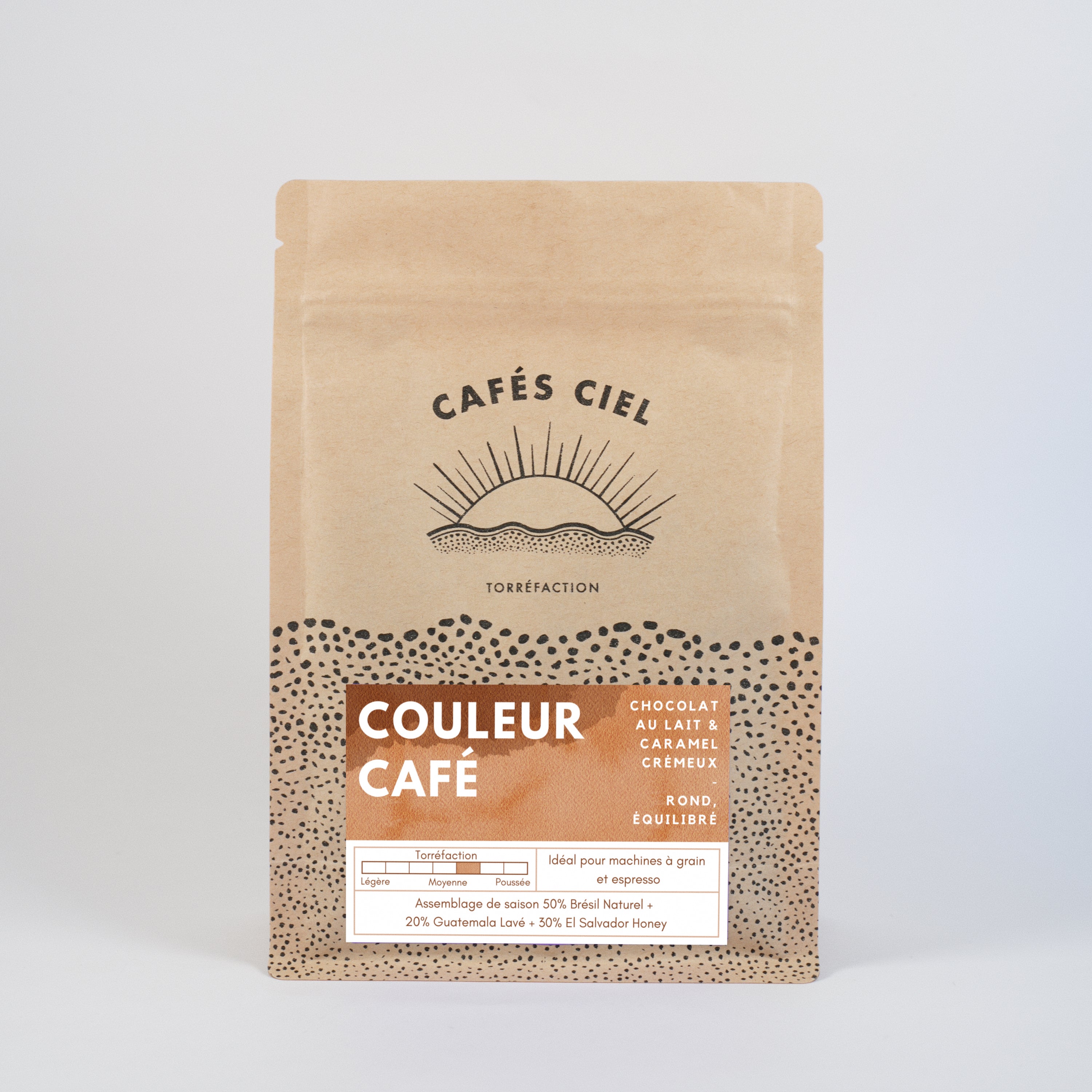 Notre 'Couleur Café' se compose de 50% de Brésil Naturel, apportant une douceur chocolatée et une base équilibrée. Les 20% de Guatemala Lavé ajoutent une touche de complexité et les 30% d'El Salvador Honey complètent cet assemblage avec une richesse sirupeuse et une pointe de douceur.